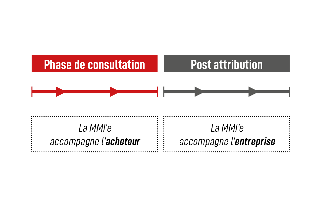 Si vous répondez à un marché public ou à une consultation privée et que vous souhaitez savoir si vous serez accompagné, vous pouvez vous reporter au paragraphe relatif aux clauses sociales. Si la MMI’e est mandatée pour accompagner les titulaires, elle sera toujours mentionnée à l’intérieur de ce paragraphe.